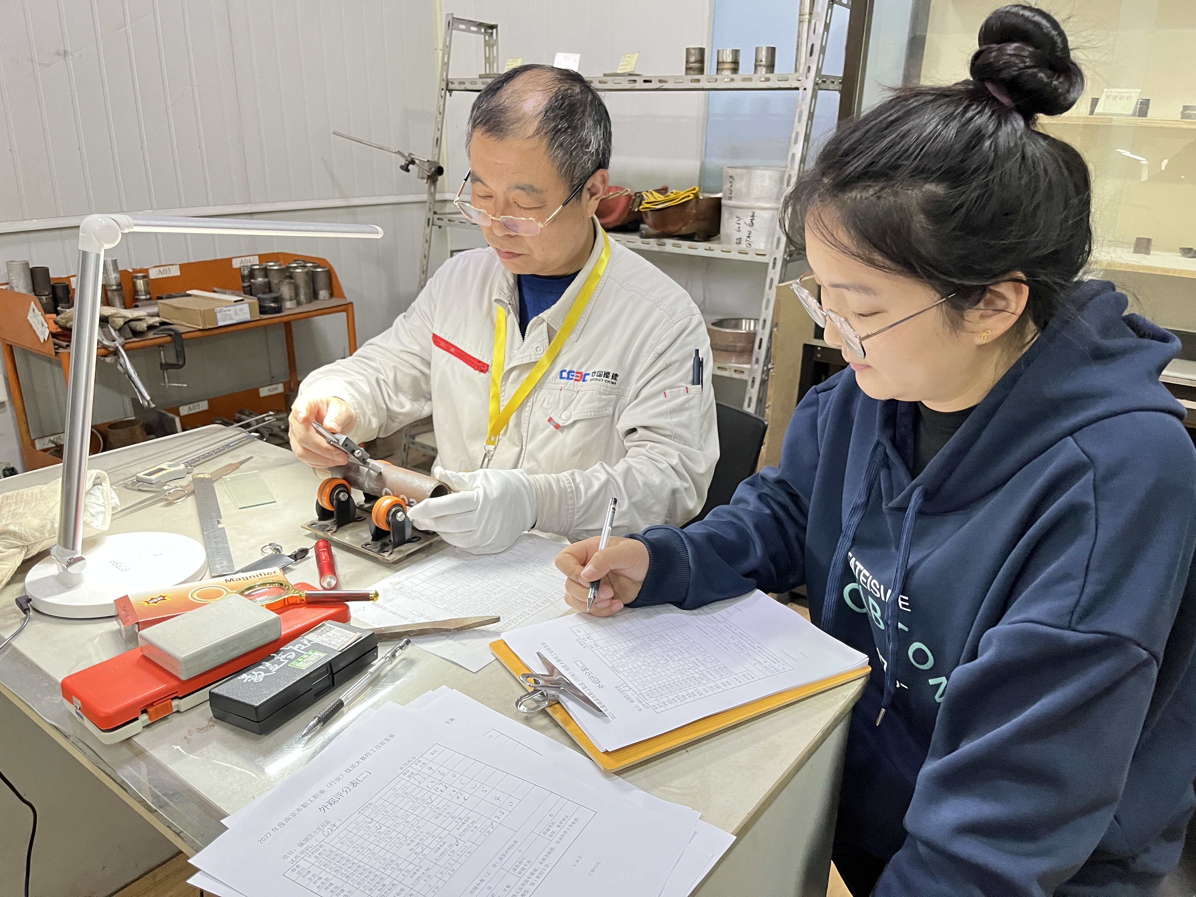 夏以琳與師傅季小燕正在對焊接技能競賽作品評分