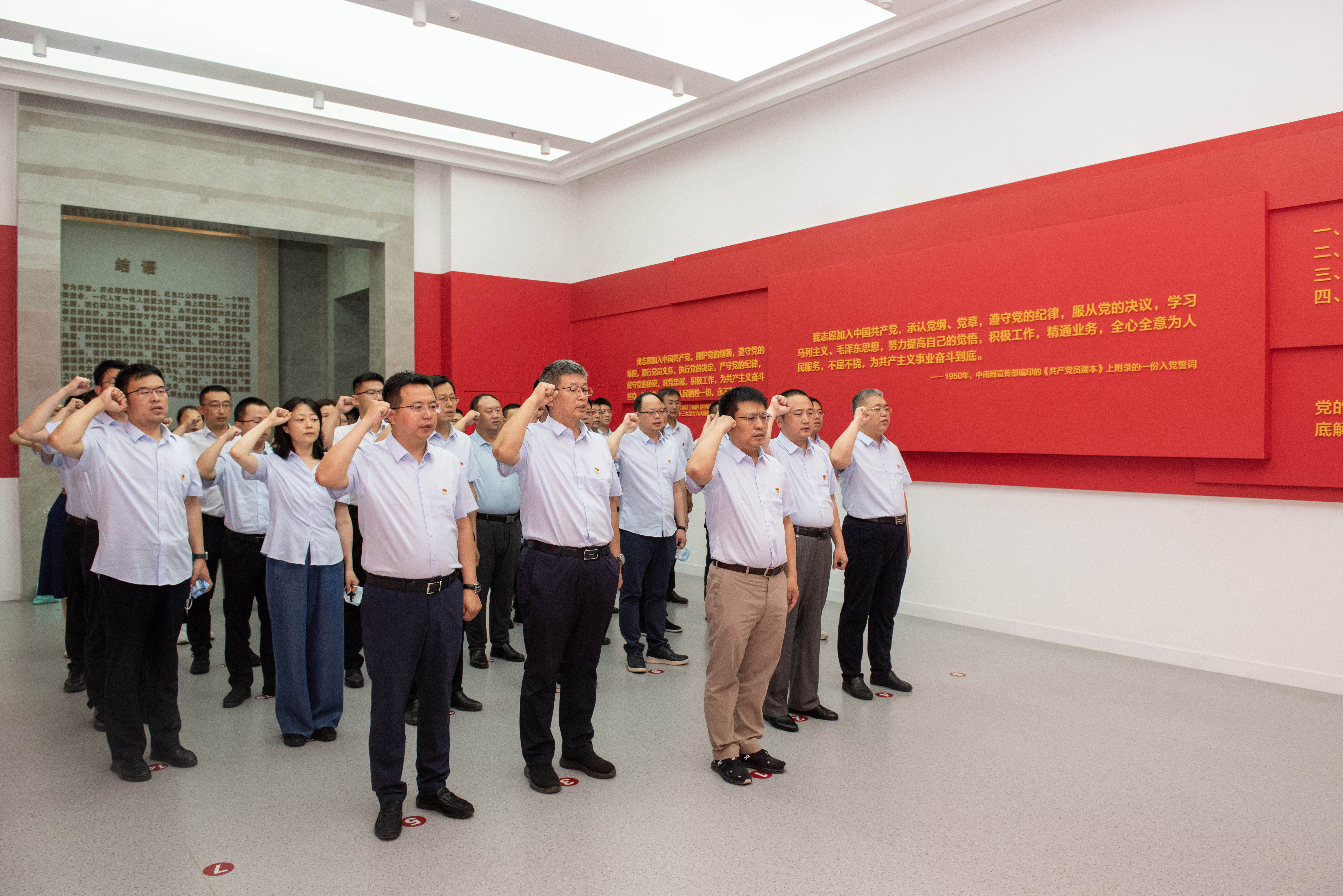 觀摩結(jié)束后,參學(xué)人員面向黨旗,握緊拳頭,鄭重宣誓,重溫入黨誓詞,銘記初心使命。